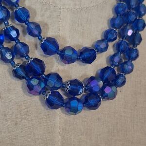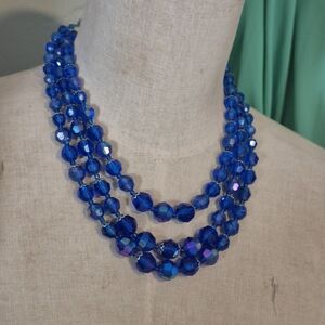 Vintage Triple Strand Crystal Aurora Borealis Glass 1960s Necklace Blue