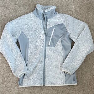 Warm and soft sherpa fleece. Perfect for chilly days. EUC. Minor wear showing on main zipper. Not really noticeable. See pictures for overall condition. Two front hand pockets and one utility pocket with zipper.