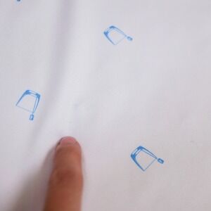 Johnnie-O men's white polo shirt featuring a repeating pattern of blue glasses. This short-sleeve polo has a classic collar and a three-button placket. The brand's signature lobster logo is subtly placed on the back collar. The fabric blend offers comfort and flexibility. Good pre-owned condition with one discoloration mark pictured.