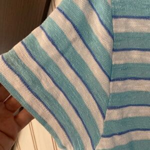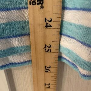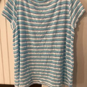 Chic striped tee with aqua and white pattern. Soft fabric. Ideal for casual wear. WOMEN'S J JILL LINEN BLEND KNIT TOP BLUE WHITE STRIPE PM