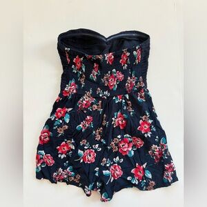 Feminine strapless romper with a colorful floral print and functional side pockets.