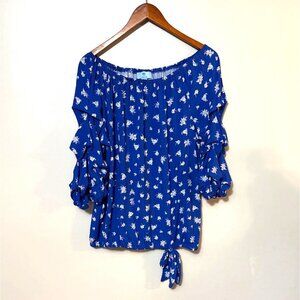 Womens Blue Floral Off-Shoulder Blouse With Tie Hem Ruffle Sleeves L 100% Rayon
