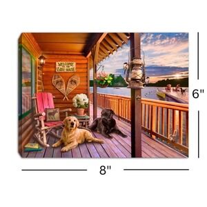 A charming lighted canvas print depicting a serene lake house porch scene at sunset. Two loyal dogs, a golden retriever and a black lab, relax on the wooden deck while a vintage lantern casts a warm glow. The scene includes rustic decor like snowshoes and a rocking chair, evoking a cozy cabin atmosphere. Perfect for adding a touch of rustic charm to your living room, den, or entryway during holidays or any time of year.