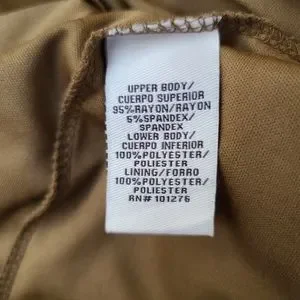 Outer, top layer 95% Rayon, 5% Spandex. Lining 100% Polyester.