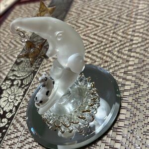 Vintage Glass Baron Handcrafted Glass Frosted Glass Crescent Moon Cow Jumped Over The Moon Collectable Figurine on Mirror Base