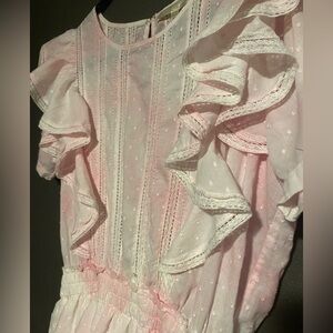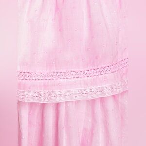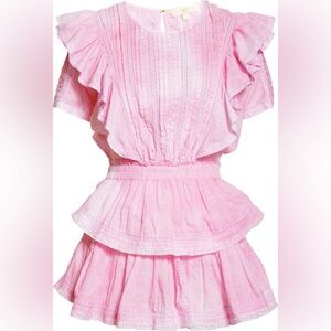 Mystery and romance abound in this dark and dotted mini aflutter in ruffles with a tiered skirt that shows off plenty of leg. Has a tye-dye effect to it in the shade “peony pink” with beautiful lace trim throughout.