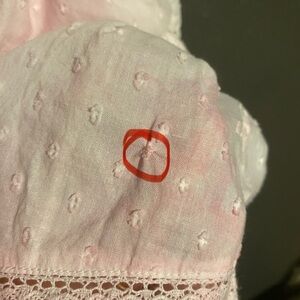 Has a callout which is noted in photos. Was 1 tiny hole but has been sewn back up and is hardly noticeable unless you are looking for it.