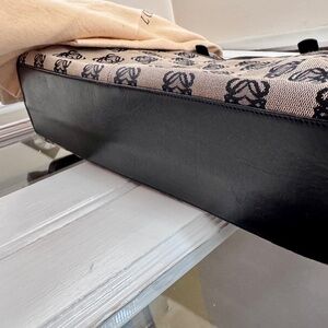 Elegant Loewe Shoulder Bag large Tote with monogram pattern in black and tan, canvas with leather trim, in pristine condition. Two exterior pockets and a large zipppered pocket inside the interior. Zipper closure. It comes with its Dustbag. Quiet luxury, classy and stylish.