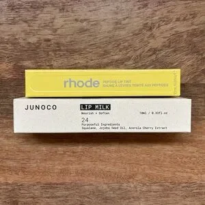 Set includes Rhode Peptide Lip Tint in last summers Lemontini and Junoco Lip Milk. Perfect for nourishing and softening lips. Both unopened/unused in original packaging. Im not going to use them and they should not go to waste! Super great products I just bought too much of each