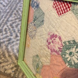 Great little shabby chic framed art ready for display. Vintage quilt has some wear- some very small rips and tears that just add to its charm. With colors of pink, yellow, blue and more. In a sturdy mint green painted frame. Would work nicely in a she-shed or nursery. Frame is 10 inches by 12 inches.