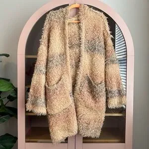Cozy and stylish fuzzy cardigan. Perfect for layering. Soft texture. Size is XS/S. It's very oversized, definitely fits more like S maybe even M than XS.
