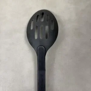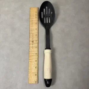 Item: Slotted serving spoon/kitchen utensil with black nylon head and wood handle.