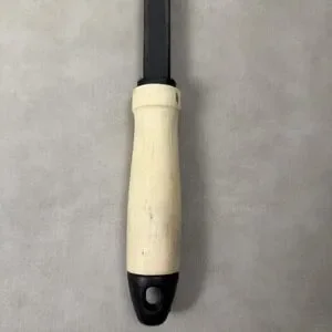 Materials: Heat-resistant nylon/plastic head and shaft; light wood handle with black hanging-loop endcap.