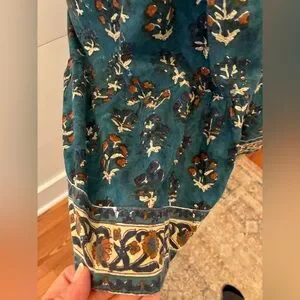 • Print: Teal/blue floral block print with contrasting border trim at cuffs and hem