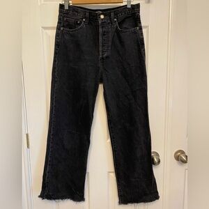 A vintage faded black 100% organic cotton Jean. Button fly, wider leg. 28 inseam 29 waist.