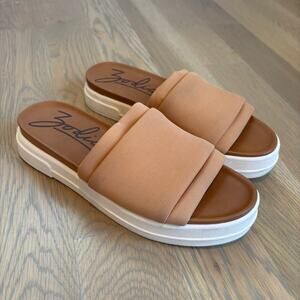 Zodiac Jolie Slide Sandal Stretch Mesh Slip On Slides Women’s Size 8. Super soft and stretchy mesh top straps. Very comfortable. Neutral tan camel color, will go with any outfit. Slightly elevated platform style. Good condition, very clean top, footbed, and sides. Light wear and dirt on bottom. Smoke free home.