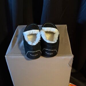 Cozy black suede slippers with plush white interior. Ideal for home comfort.