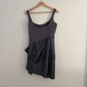 Iron grey wrap bow detail mini dress from CINQ A SEPT featuring a round neck, a sleeveless design, a fitted silhouette and a wrap panel with bow fastening. Like New Shell: 54% Poly 39% Viscose 7% Elastane Combo: 100% Silk Lining: 100% Poly 5% Spandex