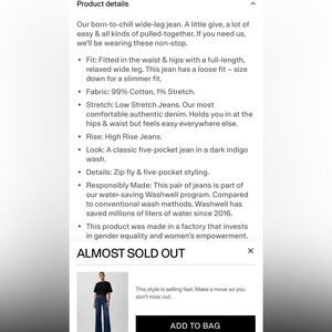 Fit: Fitted in the waist & hips with a full-length, relaxed wide leg. This jean has a loose fit – size down for a slimmer fit.