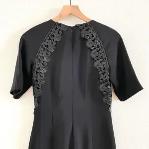 Features: Classic sheath dress in timeless black, adorned with delicate lace trim, creating a refined and chic look perfect for various occasions. Zipper closure.
