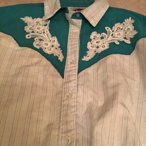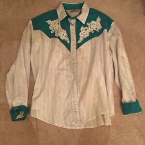 Vintage Deborah Haman Teal and Cream Western Shirt with Embroidery
