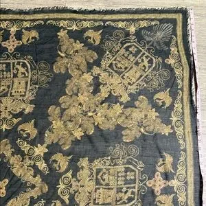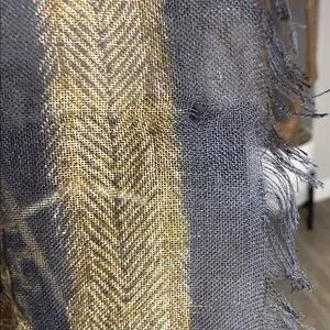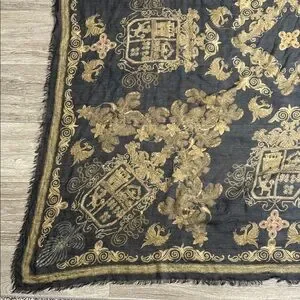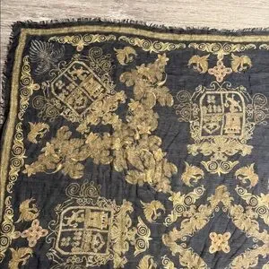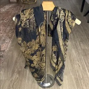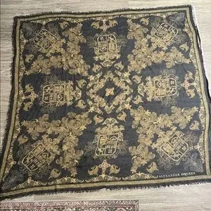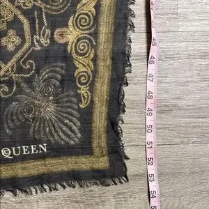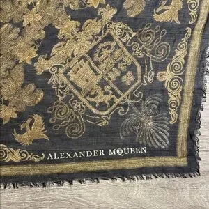 Lightweight, this alexander McQueen scarf was purchased by me at Barney’s New York almost 15 years ago. It was a limited edition. No sculls, a deep gothic black and gold pattern. Two small areas of pull, see pics. Hardly used.