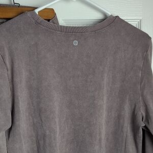 Perfect your yoga poses in this stylish taupe/lilac long sleeve top and drawstring pants set. Perfect for casual wear and or lounging at home. The top has thumb holes and pants have a drawstring closure. Great outfit for whatever moves you make throughout the day.