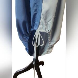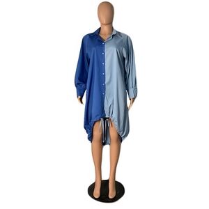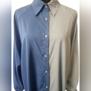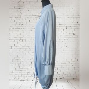 Stylish two-tone blue button-up dress with long flounce sleeves. Features a drawstring detail and a chic high low design. Measures 23" Pit to Pit and 43" in length. The beauty of this dress is you can make it shorter or longer, tailored to fit the needs of your event. Wear it long to church, or cinch it higher for date night!