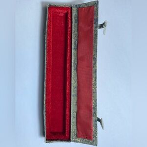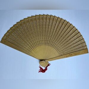 Delicate gold fan with detailed cutouts. Accented by a vibrant red tassel.