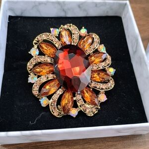 This stunning brooch features a vibrant brown gemstone surrounded by gold accents. Perfect for adding a touch of elegance to any outfit.