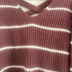 Trendy cropped knit sweater with criss-cross v-neckline detail. Features horizontal white stripes on burgundy base. Chunky waffle knit texture adds visual interest. Long sleeves and relaxed fit create casual appeal. 100% polyester