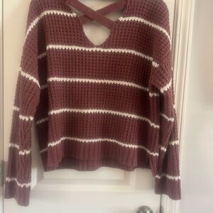 Moral Fiber Criss-Cross V-Neck Striped Sweater - Burgundy & White