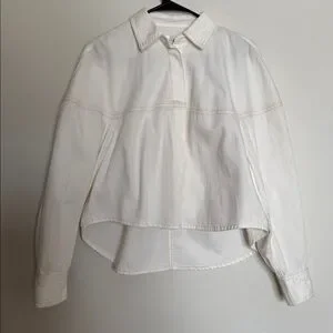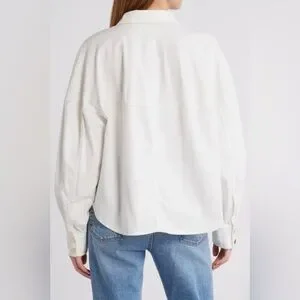 A polished cotton shirt is updated in a boxy silhouette with a high/low hem for easy movement and styling.
