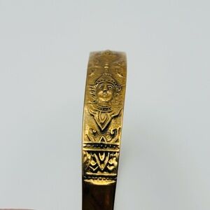 Vintage open cuff bracelet crafted in etched brass-tone metal, featuring repeating raised figural motifs inspired by Asian / Hindu-Buddhist art. The detailed faces and geometric borders give this piece a strong bohemian and ethnic aesthetic.