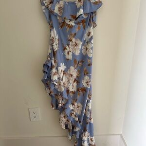 Only worn once. Elegant blue dress with white floral pattern. Features ruffled hem. Perfect for any occasion.