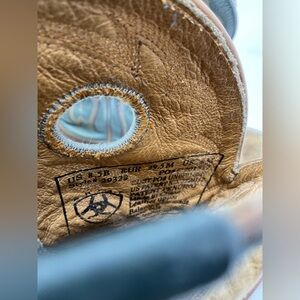 Elegant Ariat boots with a brown leather base. Features a blue embroidered shaft. Ideal for a stylish western flair.