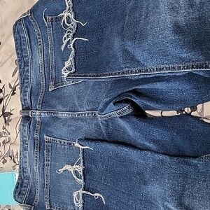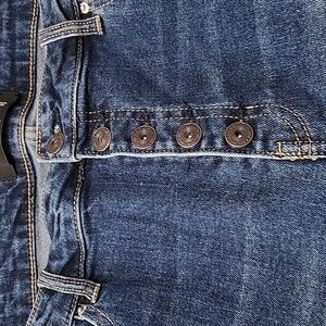 Dark wash straight leg jeans with slight fading and raw cuffs. Button fly and five pockets. Approx 17.5" across waist, 11" rise and 26" inseam
