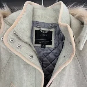 Warm and elegant wool 3/4 length coat from J Crew by Nello Gori. Gorgeous, heavy weight material, beautifully lined with hood and removable faux fur trim. 2 sets of pockets and cream fabric edging give this coat a high end winter look. Faint coffee spots in a few places but are nearly undetectable.