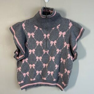 NWT Entro Gray Pink Bow Flutter Sleeve Quarter Zip Sweater Size L Coquette