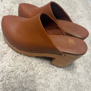 Elegant brown leather mules with wooden heels. Ideal for casual wear.