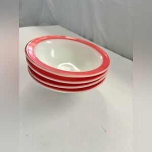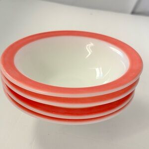 Set of four (4) vintage Pyrex bowls measuring approximately 7 inches in diameter, featuring the classic red rim design. These bowls show normal wear consistent with age and use, including light surface scratches and fading to the red rim, both typical characteristics of vintage Pyrex.