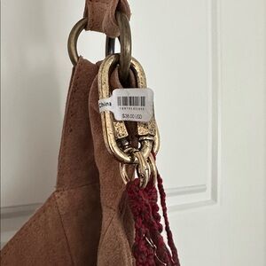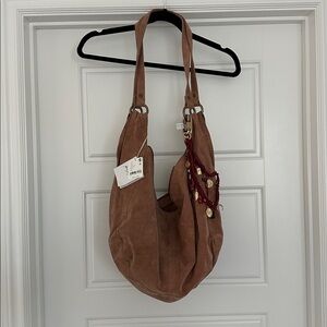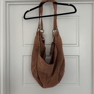 Effortlessly functional, this tote bag is featured in a slouchy hobo style with two elongated shoulder straps, all in soft suede fabrication with zipper closure for the perfect go-to bag.