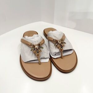 NWT Naturalizer Cremebrulee Fallyn Faux Leather Slip On Thong Sandals. Shine bright. This sandal with rhinestones knows how to make a statement. Synthetic upper with an almond toe. Rhinestone embellishments. Contour+ technology: an innovative cushioning system anatomically sculpted to meet every contour of your foot for a premium fit and all-day comfort experience. Smooth breathable lining. Non-slip outsole for stability. Tan coloring called cremebrulee. Size 6.5m.