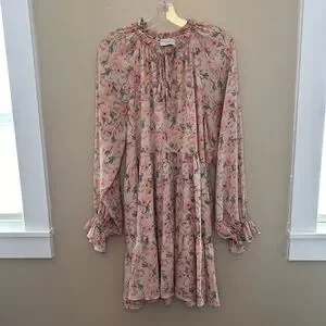 Charming floral pink dress perfect for any occasion. Features a delightful floral pattern that adds a touch of elegance. Excellent condition. No holes, stains, odors, etc. Sheer sleeves. Lined bodice.