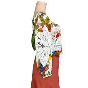 Farm Rio Off-White Forest Birds Blouse features a colorful tropical bird and forest print on an off-white background, with a square neckline, three-quarter length puff sleeves with elastic cuffs, and crochet and guipure lace embellishments across the chest and sleeves.