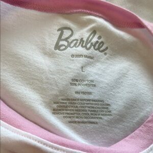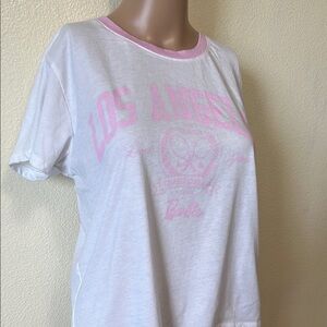 This Barbie t-shirt features a stylish white and pink design with a fun graphic print. Perfect for casual wear, it offers comfort and a trendy look.