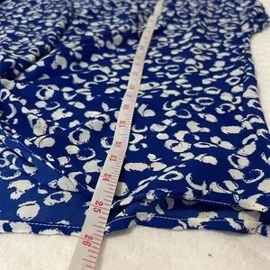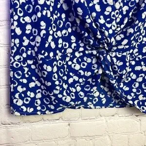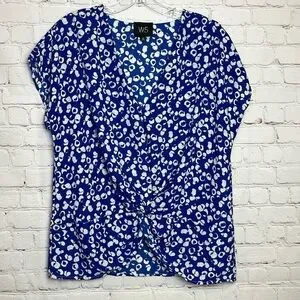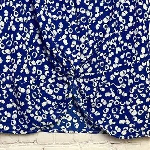 W5 blue and white circular/bubble print short sleeve blouse. V neck line. Twist front cropped silhouette.