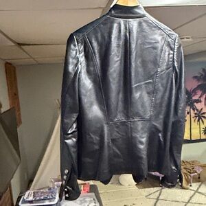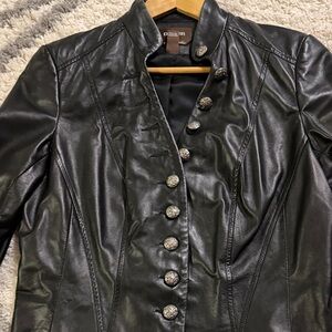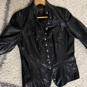 Elegant leather jacket with unique button accents. Perfect for a stylish ensemble.