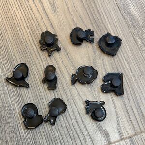 Set of horror-themed shoe charms featuring iconic characters. Perfect for adding a spooky touch to your footwear. Includes a variety of designs in black, red, and white.