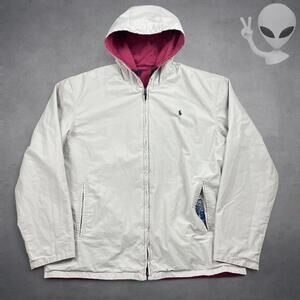Authentic Polo Ralph Lauren reversible hooded jacket in like-new condition with no flaws. Made from 100% cotton, it offers soft, breathable fabric with a comfortable medium fit. Features a white exterior and pink interior for versatile styling. Please check measurements to ensure the best fit.